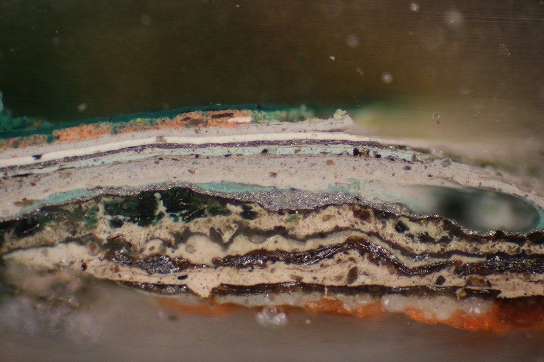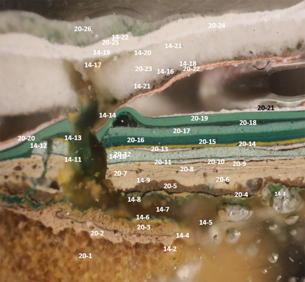 | 20-12 | Capa pictórica de color verde claro aglutinada con aceite. | 80–120 µm |
