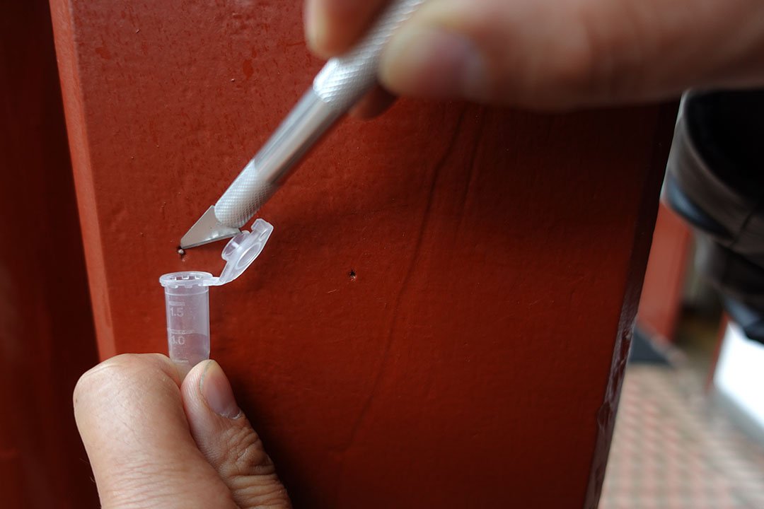 Los cortes estratigráficos se toman de lugares del edificio que brinden la mayor cantidad posible de información. Así mismo, de sitios de la fachada en los que existen bordes, o pequeños deterioros que permitan corroborar que se están sacando todas las capas. Normalmente, las muestras se toman con un bisturí y después de ser procesadas, para convertirlas en un corte estratigráfico, se observan en el microscopio para poder identificar los estratos, caracterizar las capas y obtener datos acerca de las secuencias de estratos. Este tipo de análisis los hacen diferentes profesionales que trabajan en las ciencias de la conservación del patrimonio cultural (ingenieros, químicos, microbiólogos o restauradores, entre otros) como los del equipo de trabajo del Laboratorio de Estudios de Artes y Patrimonio – LEAP de la Universidad de los Andes